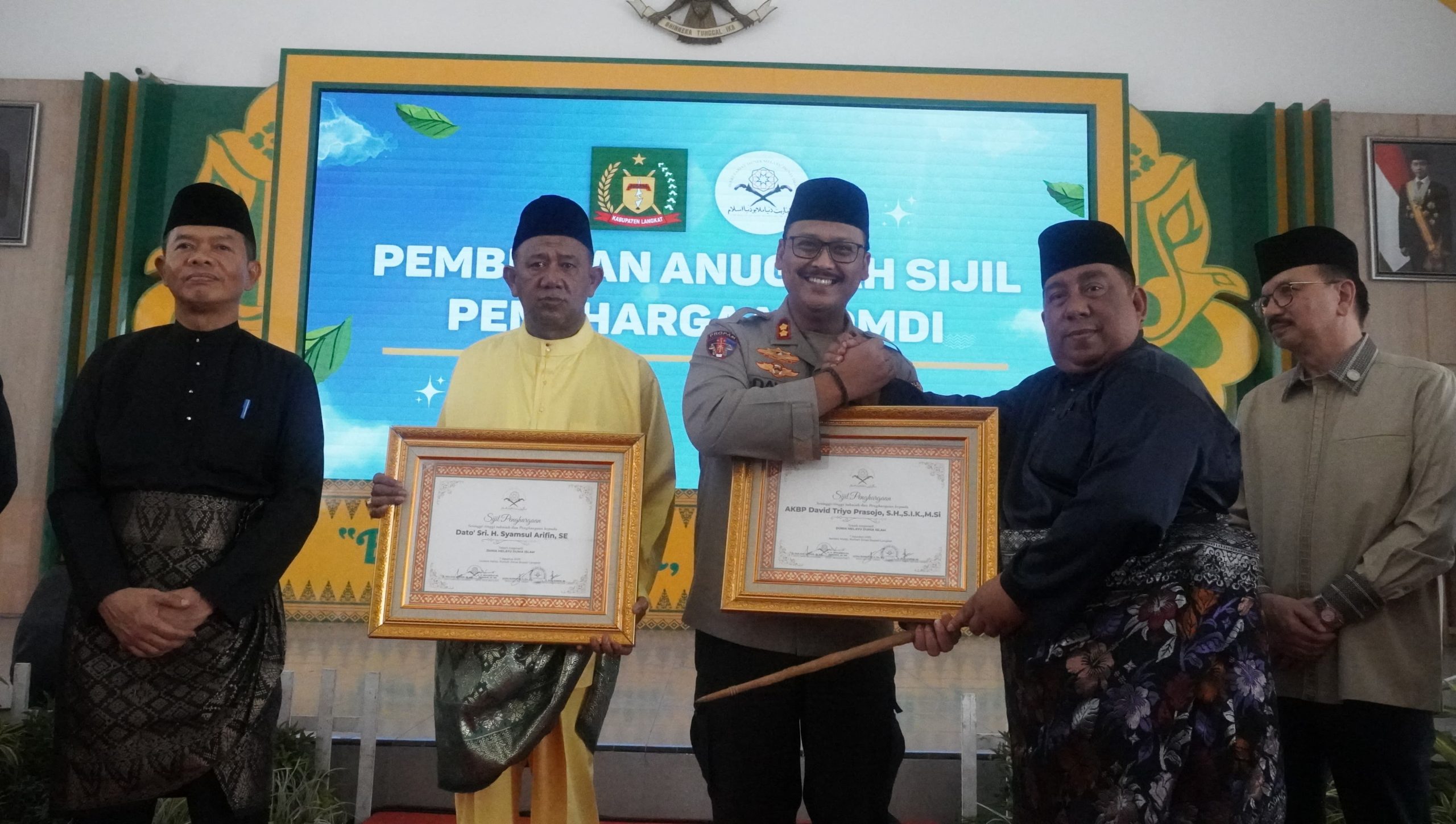 Langkat – Kapolres Langkat, AKBP David Triyo Prasojo, SH, SIK, MSi, menerima penghargaan sebagai Tokoh Inspiratif Dunia Melayu Dunia Islam (DMDI) Kabupaten Langkat dalam acara Pelantikan DMDI Kab. Langkat bertema Dakwah Serantau Antar Bangsa, yang digelar pada Kamis (7/8/2025) di Aula Jantera Malay, Rumah Dinas Bupati Langkat.
